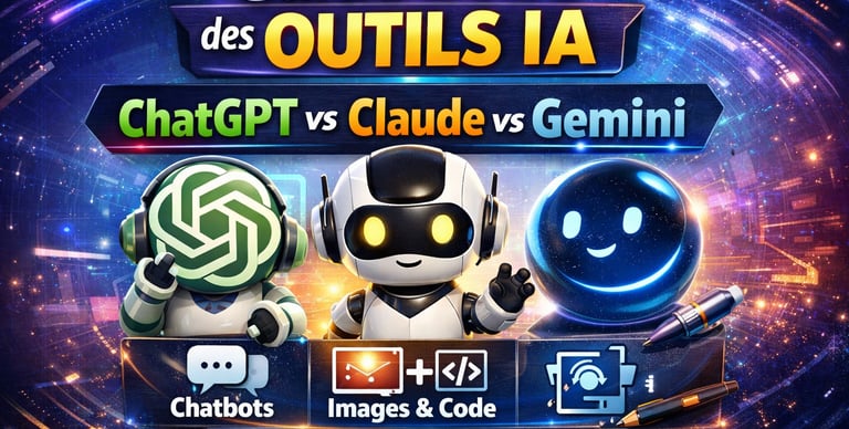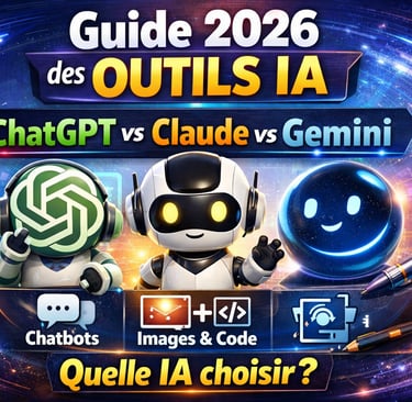 Guide 2026 des outils IA : chatbots, générateurs d'images, assistants code. Comparatif ChatGPT vs Claude vs Gemini. Trouvez l'IA parfaite pour vos besoins.